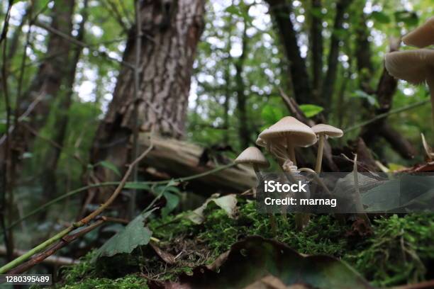 Big Cluster Of Large Mushrooms Grow From The Roots Up A Fallen